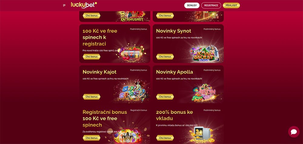 V casinu LuckyBet je připraven registrační bonus, kdy získáte 100 free spinů v hodnotě 100 Kč. Bonus může získat každý nově registrovaný hráč okamžitě po kompletním dokončení registračního procesu. Bonus je vyplácen najednou a lze využít na libovolných hrách od herního vývojáře Synot.